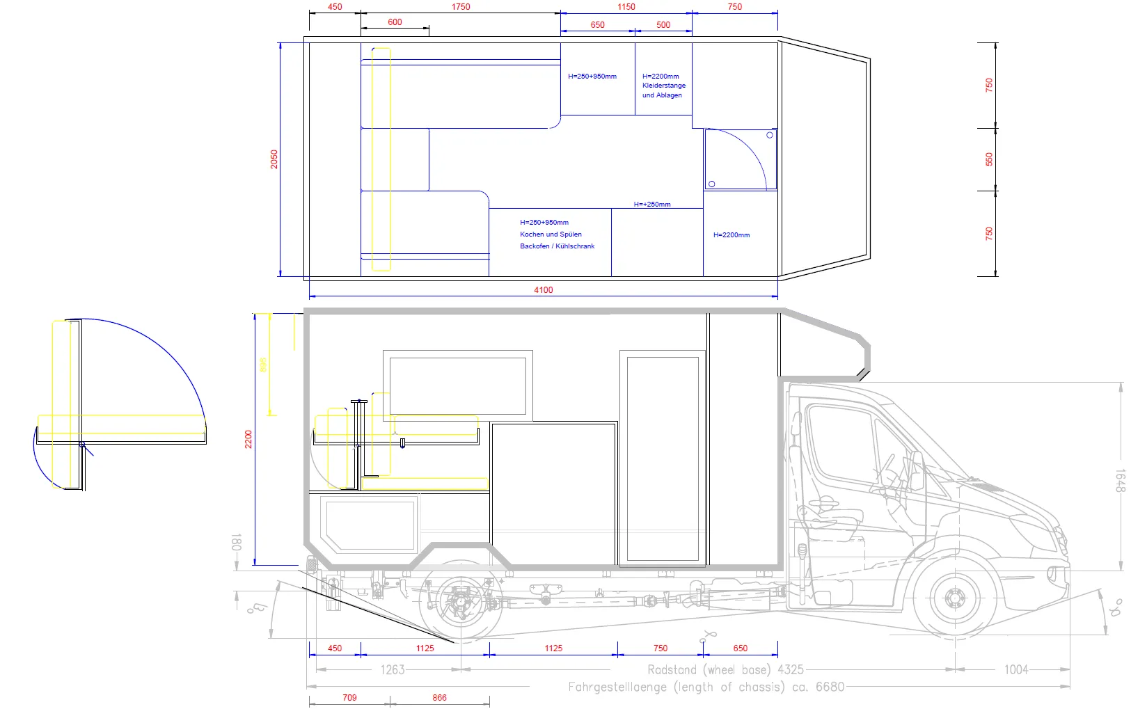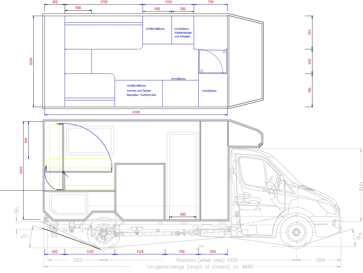 Tobi Ich habe aber mal Deine Idee des zusätzlichen Scharniers aufgegriffen, ergibt zwar ein ganz ordentliches Paket, allerdings auch ein besseres Raumgefühl, Platz für Oberschränke und sogar ggf. ein Heckfenster ... mmmmh wird schon ein spannendes Thema