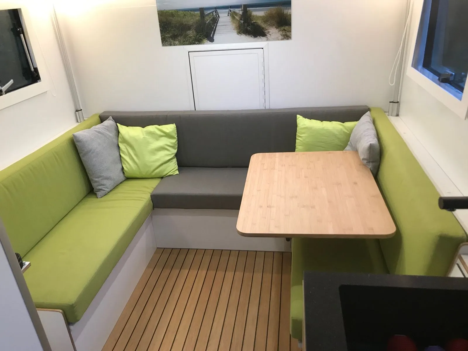 Irgendeinen Kompromiss muss man machen bei 3,6m Kabinenlänge. Der Raum zum sitzen und schlafen war uns wichtig, ebenso der rundum Ausblick. Die 2min Umbau stören wirklich nicht, wenn man das Bettzeug hinten liegen hat. Wir haben da einen Toppen von 180x200cm der zusammengefaltet hinten liegt. Der ist ruckzuck über die Polster ausgefaltet und das Bett ist fertig. Ich glaube nicht dass eine Klappkonstruktion weniger Arbeit macht.