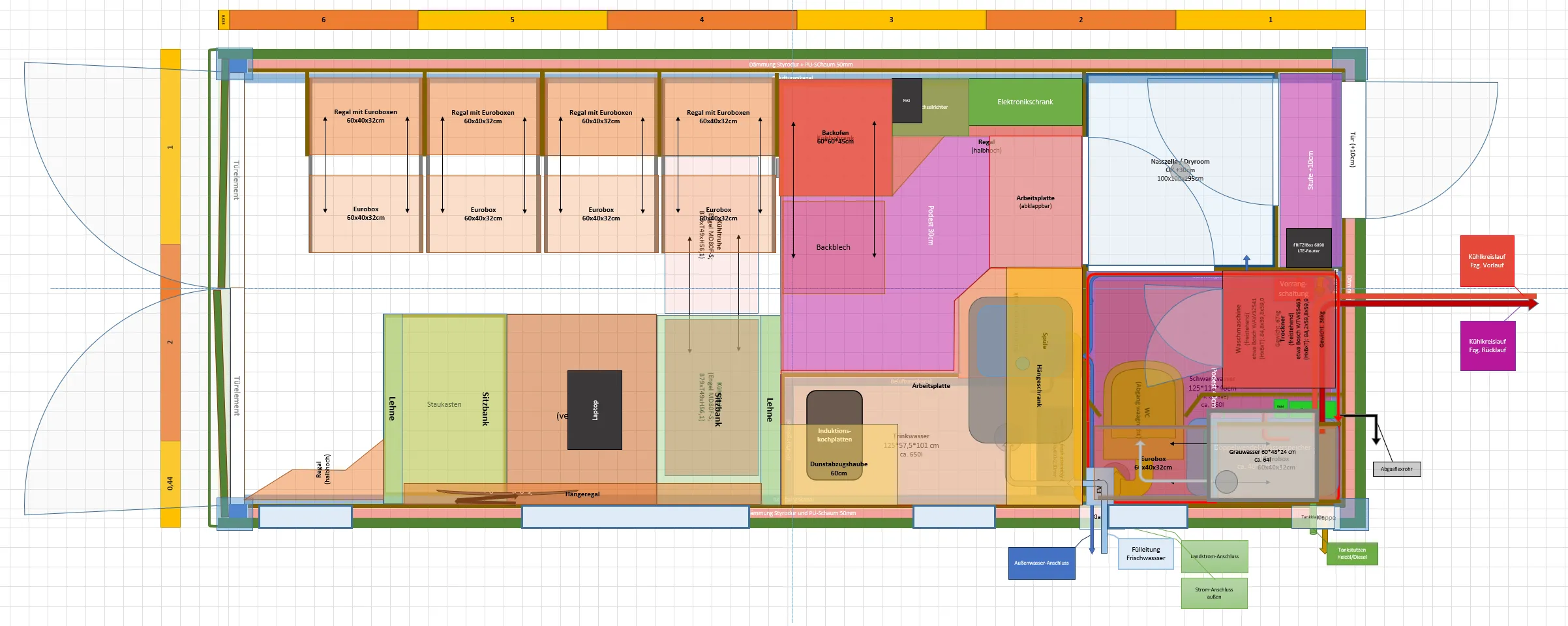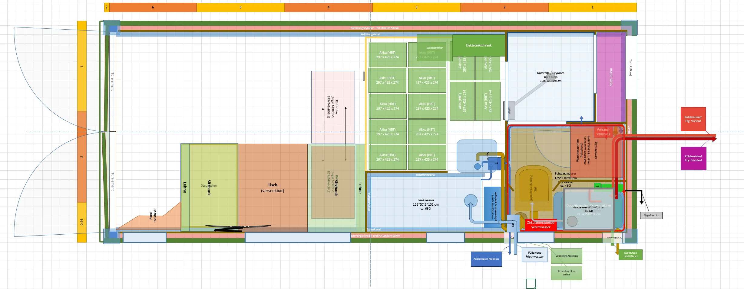 Ziel wäre es, 2 Wochen mit den Wasservorräten auszukommen (deswegen 650l Frischwasser); die 1,8kWp Photovoltaik auf dem Dach werfen hoffentlich genug Strom ab, um im Container ohne Gas zu kochen (und vielleicht auch die Heizung elektrisch zu betreiben? Ich liebäugele derzeit mit einer wasserbasierten Fußbodenheizung, die durch den Kühlkreislauf des Fahrzeugs unterstützt werden könnte). Die Anzahl der hierfür nötigen Akkus ist für mich noch ein großes Fragezeichen, wenngleich man das sicher berechnen könnte...