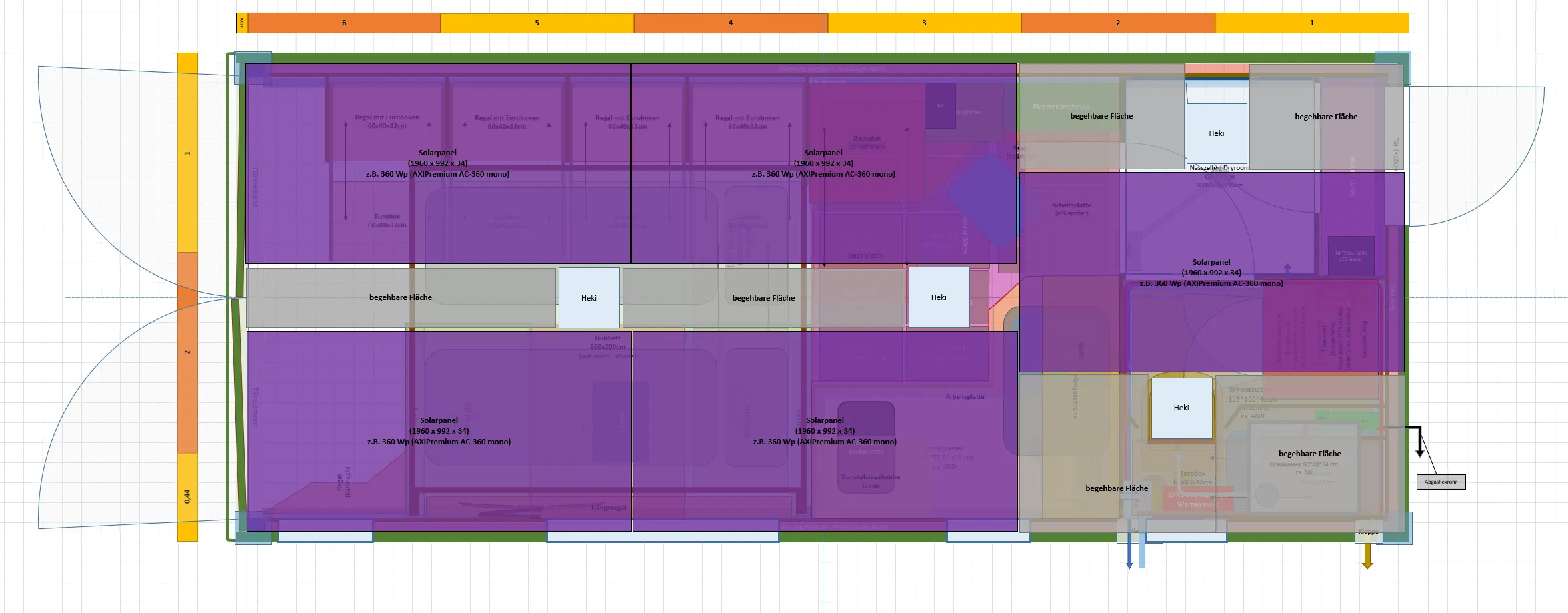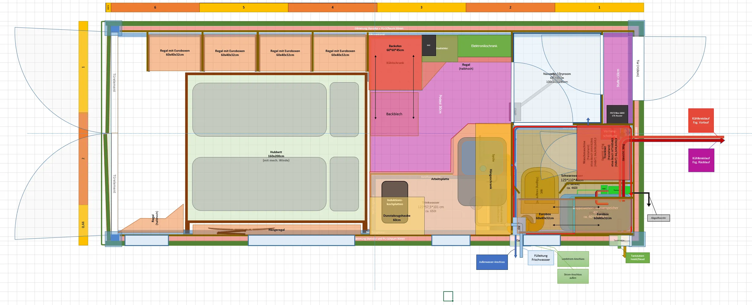 ich habe nun einige Zeit über Grundrissen gebrütet, die mein Projekt weiterbringen sollen. Ich habe mich (aus verschiedenen Gründen) darauf eingeschossen, einen 20'' Seecontainer auszubauen und möchte euch heute eine (von mehreren alternativen) Ideen für einen Grundriss vorstellen mit der Bitte, mir eure (konstruktiven) Gedanken hierzu mitzuteilen. Unten findet ihr den Grundriss in verschiedenen Schichten, so dass es euch leichter fallen mag, eine genauere Vorstellung zu gewinnen.