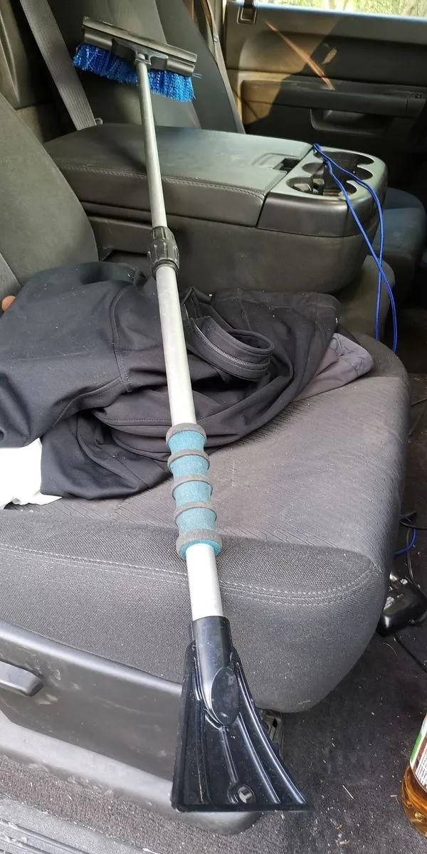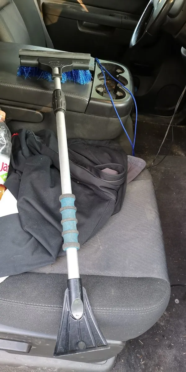 Ja, richtig ein ausziehbarer Eiskratzer mit Bürste und Gummilippe zum Scheiben Reinigen. Ausziehen, einmal mit der Gumilippe über die Linse und es passt wieder für eine weile
