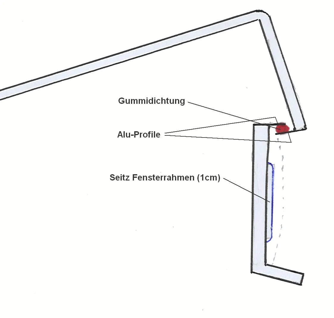 Ich habe eine Hubhöhe von 70 cm. Entscheidend ist, dass der Drehpunkt vorne genau in der Mitte, also bei mir bei 35 cm liegt. Dann beschreibt das an der Unterkante des Daches angebrachte Aluprofil in etwa den Weg der gestrichelten Linie. Das Dach berührt noch nicht einmal den Rahmen des Seitz-Fensters, der ca. 1 cm hervorsteht. Das obere Aluprofil ist von innen angeschraubt, damit ich das Dach auch mal für Wartungsarbeiten höher aufklappen kann. Im zugeklappten Zustand dichtet eine weitere (nicht eingezeichnete) Dichtung unter dem unteren Aluprofil das Dachteil zur Innenseite ab. Als Aluprofil habe ich Flachalu 25 mm * 2 mm verwendet. Diese Art mit den Aluprofilen ist natürlich eine kleine Kältebrücke, aber Kondenswasser könnte ggf. nach außen ablaufen.