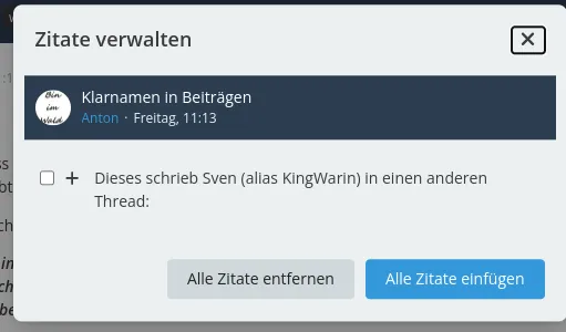 Dann einfach in den gewünschten anderen Thread gehen, Antwort anfangen zu Tippen und dann wenn das Zitat kommen soll diese Schaltfläche anklicken und "Alle Zitate einfügen" wählen (oder wenn es mehr als eins ist das kleine Plus am gewünschten Zitat klicken)