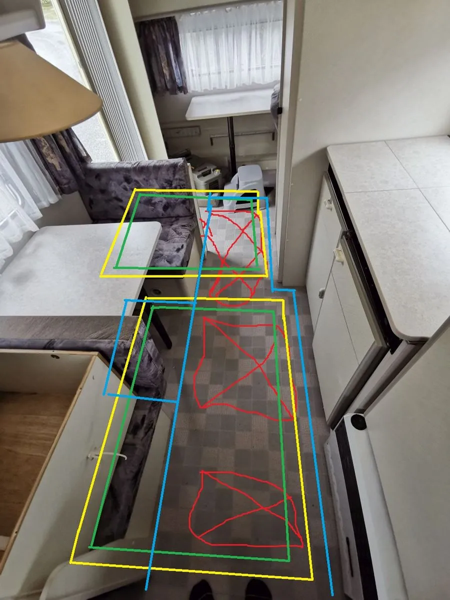 So sieht der Grundriss vom Fahrzeug aus. An den Durchgangsstellen ist der Boden halt "auf" Besonders in den roten Stellen.