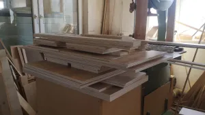 Heute hab ich mit dem Bau der Möbel begonnen. Da mir die Schreinerwerkstatt eines Kunden samt aller Maschinen zur Verfügung steht ist das natürlich ein großer Vorteil. So konnte ich dank der tatkräftigen Unterstützung des Chefs innerhalb von zwei Stunden ca. 60% der erforderlicher Möbelzuschnitte erledigen.