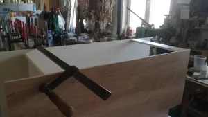 Verbinden aller Teile eines Schranks, in dem Fall ein Higboard das als Kleiderschrank für hängende Kleidung dient. Als Verbinder werden Lamellos verwendet. Mit Hilfe der entsprechende Maschine ist es ein Klacks die Fräsungen dafür zu erstellen. Anschließend werden die Sichtkanten mit Umleimer versehen - selbstverständlich ist auch hier die entsprechende Maschine vorhanden. Dann wird der Schrank mittel PU Leim endgültig zusammen gebaut. Vorab schon mal die ersten Bilder