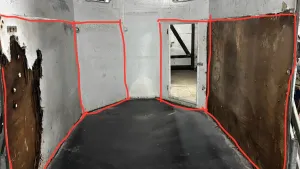 Die rot umrandeten Wände sind die besagten morschen GFK/Holz-Platten, dahinter befindet sich noch die Poly außenhaut, also die komplette äußere Schale, welche auch intakt ist.