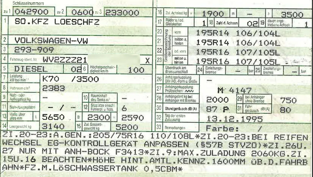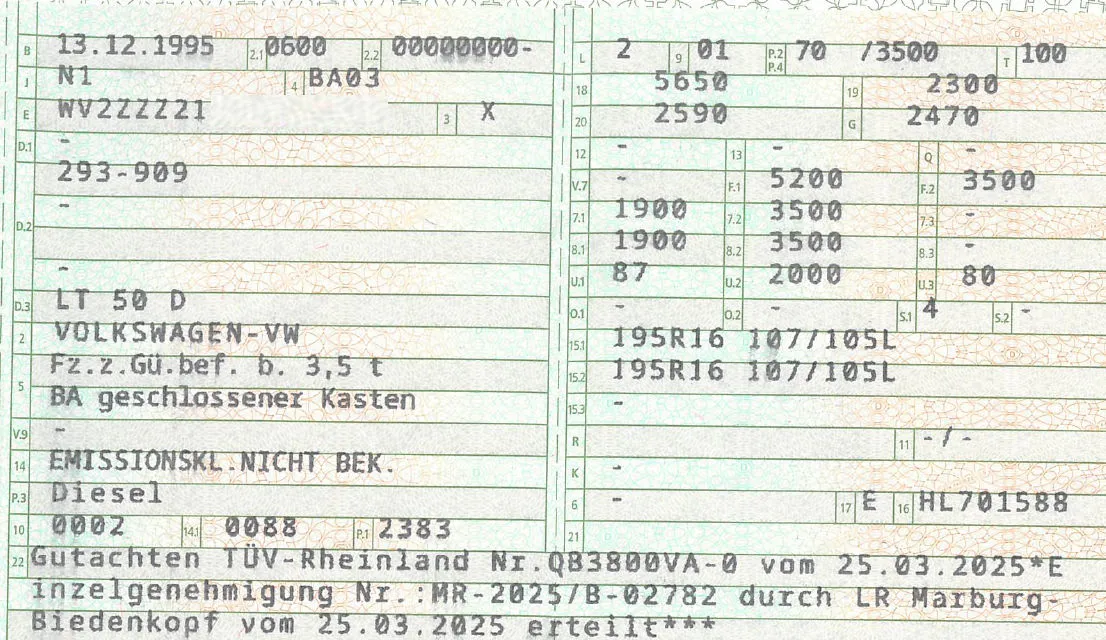 Dann wurde erstmal F.2 Abgelastet (TÜV Rheinland) um ihn mit B fahren zu dürfen. Dabei wurde es auch direkt ein N1 BA03, da er noch zu jung für H war / ist und SO.KFZ. privat nicht geht.