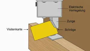 Ja so ein kleiner Magnetschnapper (wie z.B. von Temu). Wenn man das bewegliche Teil umdrehen könnte, und die Verriegelung so anbringen könnte, dass die Schräge nach vorne zeigt (wenn die Schublade zu ist) könnte man das Schloss mit der Hand und einer Visitenkarte öffnen zur Not. Wie bei einer Tür, nur ohne Falz und andersherum. Schwierig zu erklären. Wenn man vor der Schublade steht und einen die Schräge anschaut, dann klappt das mit der Karte.
