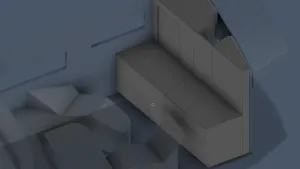Anton: ich habe das mal im 3D Programm skizziert, damit es sauber wird. So Winkel täuschen leider recht schnell. Aber ja: weniger tote Fläche wäre gut. Ich habe aber schon das Optimum erreicht - zumindest nach meinen bisherigen Versuchen, das ganze hin-und-her zu schieben, den Radius zu vergrößern, etc. (Es ist dann immer an eine Ecke nicht mehr passend: z.B. Durchstieg muss noch erreichbar sein, AusgangsTür seitlich (hier unten, links neben dem Eck-Korpus (mit Kühlschrank)) wird dann immer irgendwie zu eng.