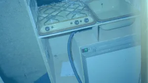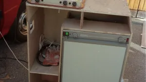 Der Warmluftkamin war die Pressung rechts (Sieht man da noch nicht) und das Abgasrohr musste natürlich abgenommen werden, das war von der Schiebetüre her gut zugänglich und mit einer Federspange befestigt, dasselbe mit dem Abwasser. Also drei Griffe und die Küche konnte vor den Camper gehoben werden. Hab ich aber nie gemacht...
