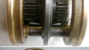 Und man sieht sogar die kleinen Klötzchen an der Seite, die auch diese Zahnräder haben. Diese sind allerdings "spitz gefeilt" damit der Mitnehmerring nach dem synchronisieren reinrutscht. Denn nach dem Synchronisieren ist ja die Drehzahldifferenz 0, und man muss vermeiden das Klötzchen auf Klötzchen steht. Also Spitze auf Spitze.