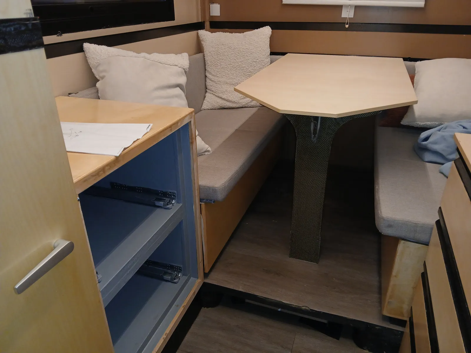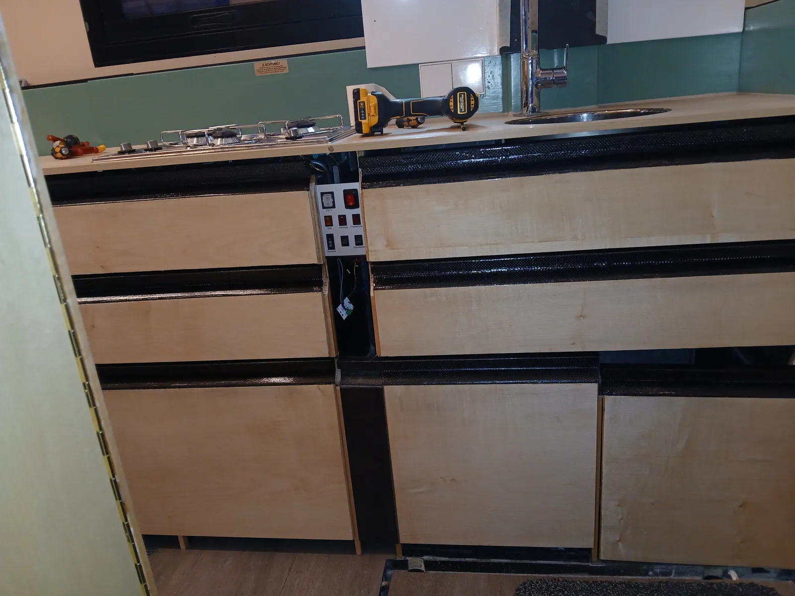 Wir haben mit Ahornfurnier angefangen und die Wandfarbe festgelegt. Später wurde die Decke von beige auf weiss umlackiert. Mit dem grün der Küchenblende und den schwarzen Streifen von Rinnen, Griffen und Fenstern sind schöne Akzente entstanden. Nun soll aber nicht alles furniert werden, abgesehen von der aufwändigen Arbeit wird das eine Holzwüste.