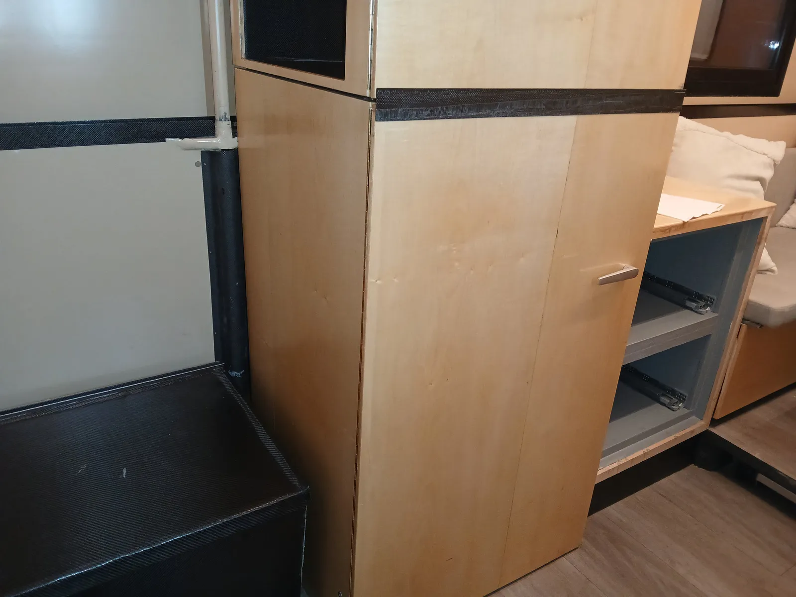 ich meine den senkrechten, 8 cm breiten Streifen. Eine durchgehende Klappe oder drei mit schwarzen Griffleistenabschnitten, aber nicht mit Furnier, wie hier animiert