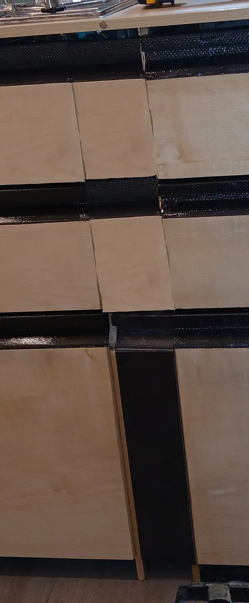 Und was ist mit dem Streifen zwischen den Schubladen. Der ist entstanden, weil ich bei geschlossener Badezimmertür die Schubladen links und rechts noch öffnen können will. Ich habe noch Frontreste mit Griffleisten, möchte aber kein Furnier kleben.