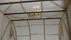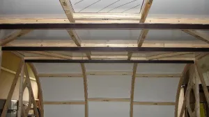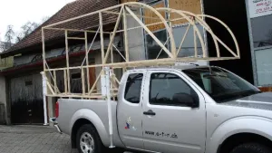 Also die Verbindung der Holzleisten hergestellt aus Kerto Furnierschichtholz siehe http://finnforest-new.visualsystems.com/de/default.asp…455;10456;10463 wurden mit Sikaflex 252 verklebt und mit edelstahlholzschrauben verschraubt an exponierten Stellen mit Winkeln verstärkt. Die Festigkeit des Holzgerippes wurde mit den diversen Diagonalverstrebungen erreicht. Siehe Bilder. Durch die Verklebung der GFK Platten und Isolation erreicht die Kabine ihre endfestigkeit. Da die Kabine im abgesattelten zustand auf den Stützen steht, habe ich die verstrebungen so gewählt das der Unterteil nicht durchhängen kann. Bis jetzt ist alles im grünen Bereich. Alles eine kleine Lotterie. Es wird schon gut.