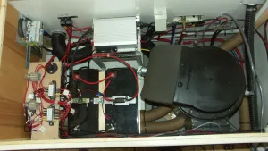 In die Zweiersitzbank, in der sich die Ganze Technik befindet wurde ein 3 teiliger Zwischenboden eingebaut, so daß hier noch ein ca. 18 cm hoher Stauraum gewonnen werden konnte. Ferner wurde die Rückenlehne mit Staufächer für Bücher, Zeitschriten etc. versehen.