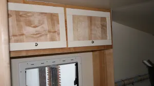 So die Klappen (7Stck) für die Oberschränke sind "Gott sei Dank" fertig und montiert. Wie Ihr auf den Bildern sehen könnt wurden die Klappen aus gehobelten Fichteholzlatten ( 55x15mm) und 6 mm birkefunierten Pappelsperrholz als Füllung gebaut. Hierzu wurden die Fichteholzlatten einseitig genutet, gefaßt, geschliffen und mit der gleichen PU-Farbe wie die Kabinenwände versehen. Zum auftragen der Farbe wurde eine kleine Schaumstoffwalze verwendet. Als Verschluß wurden mini Pushlocks montiert.