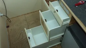 Mal wieder ein kleiner Zwischenbericht zum Ausbau. Die Schubladen für den Heckschrank und den Küchenblock sind soweit fertig und eingebaut. Die 3 Schubladen für den Küchenblock wurden mit Vollauzügen versehen. Die beiden Schubladen vom Heckschrank sind mit normalen kugelgelagerten Teilauszügen versehen worden. Im Heckschrank habe ich leider ein Konstruktionsfehler