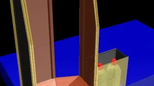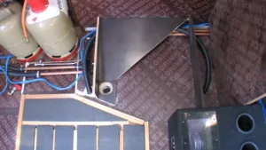 Die hellbraunen Teile sind 15er Multiplexstückchen, alles dunkelbraune 4mm Siebdruck. Bis auf die Wand zum Innenraum hin, die ist 6,5mm weil freitragend. Die Beplankung (innen auch 4mm phenolbeschichtet Birke und dann wieder der PE-Schaum wie auch nach vorne sichtbar) ist hier versteckt, damit man die Duschtasse sehen kann.