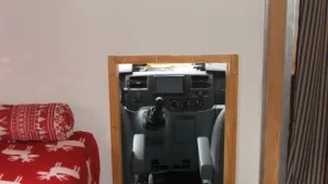 Am Wochenende war wieder Arbeitstag, ich wollte doch den Duchbruch endlich fertig stellen. Erstes Bild: Erstmaliger Blick aus dem Koffer in das Führerhaus, zweites Bild: Sicht auf den Querschnitt des Durchbruchs. Rechts seht Ihr den Rahmen vom Führerhaus. Von rechts nach links: Holzrahmen, Folie, Terrostat, Blech, Holzrahmen. Verschraubt mit Maschinenschrauben.