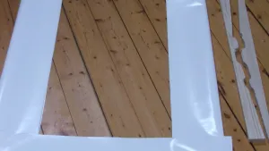Wenn morgen, wie angekündigt, das Wetter stimmt, wird der Durchbruch ausgeschnitten. Heute habe ich die flexible Verbindung geschnitten und verklebt. Material: LKW-Plane, Gewebe mit PVC. Geklebt mit Teichfolienkleber.