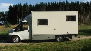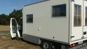 ich habe zwar noch nicht den Durchbruch gemacht, aber einen Dachspoiler aufsetzen lassen. Das Aussehen war nicht der Hauptgrund (obwohl ich finde, der Wagen sieht gefälliger aus), aber den Spritverbrauch wollte ich schon möglichst verringern. Auf den folgenden Bildern seht Ihr nicht nur die neue Optik, sondern auch die Seitenkästen und den hinteren Unterbau, der die Klappstühle beherbergt. Auch die beim Kauf des Koffers im Preis enthaltene hintere Aufstiegstreppe, die mir gute Dienste als Stütze für den selbstgebauten Fahradträger leistet, ist gut zu sehen. Das letzte Bild zeigt dann den Effekt, für den ich den Industriekoffer ausdrücklich wollte. Ich denke, es ist selbsterklärend.