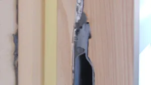 Und nun das Ergebnis: Holzrahmen mit Blende versehen, mit Schnellschliffgrund grundiert und mit Ballenmattierung endbehandelt. Blick von innen auf den fertigen Durchstieg.