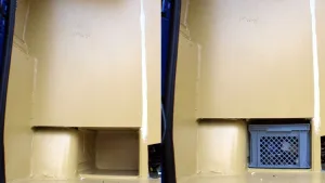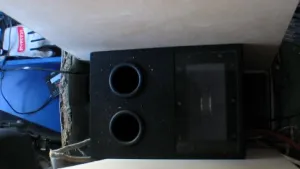 Das dicke Rohr links unten im Bild ist ein Abzweig von der Fahrerhaus-Luftheizung, der dann hintem im Wohnraum schonmal vorheizt. Man sieht noch ein zweites Loch, wo auch noch so ein Rohr reinkommt, das dann nicht hinter der Dusche entlang in den Sitzgruppen-Fußraum geht, sondern direkt an der Küche den Fußraum erwärmt.