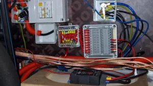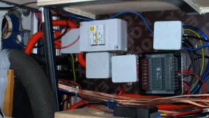 Eins weiter rechts, ist der Plusverteiler, man erkennt das dicke Kabel was von unten hineinführt. rechts daneben der Sicherungskasten mit transparentem Deckel, drüber (im Bild drunter) an der Wand der Solarregler und im Bild oberhalb der Minusverteiler.