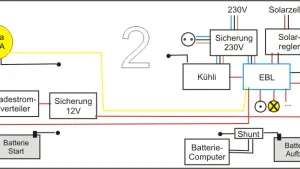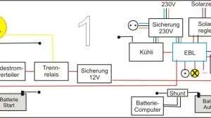 Zentrum der Schaltung soll wenn möglich (und sinnvoll?) der Schaudt EBL 208S sein. Dazu hab ich mal 2 Schaltpläne gemalt, weil ich nicht weiß, ob er auch ne Trennrelais-Funktion übernimmt ...