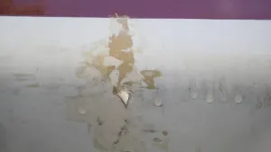 Bild2: Obere Dachkante rechts hinten; dort läuft das Wasser zusammen. Bild zeigt Zustand vor Schleif- und Lackierarbeiten