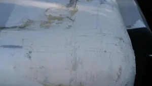 An einer Stelle ist wohl vom Dach her (Übergang Knick vorn/hinten) Wasser in die Seite geraten. Dort löst sich das GfK vom Styropor. Wenn man irgendwie rankommt, kann man das wieder ankleben (es gibt einen Super-Kleber dafür in Kartuschenform). Ich mußte das machen, da an einer Stelle vom Fenster her ein Spannungsriß im GfK entstanden war. Ist leicht zu reparieren mit Profi-Harz von r&g. Das Problem ist, daß sich das GfK in der Sonne ausdehnt und Falten wirft, wenn es nicht mehr an der Isolierung klebt. Dadurch wird die Ablösung mit der Zeit immer schlimmer. Kleben geht gut im Herbst: GfK aufheizen mit Fön, es dehnt sich aus. Dann Kleber reinspritzen und GfK abkühlen, es zieht sich zusammen und klebt (zusätzlich hab ich eine Holzplatte zum Gegendruck angebracht).
