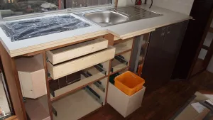 Anprobe Küchenblock. Die Arbeitsplatte ist aus wasserfest verleimtem Multiplex und Resopaloberfläche - gegenüber Spanplatten ist das ein Federgewicht ! und kann problemlos auch schmale Brücken zwischen Rand und Spüle oder zwischen 2 Ausschnitten aushalten.