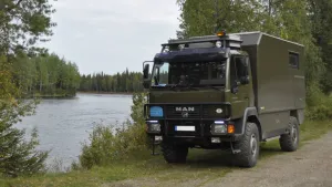 Zur Wagenfarbe: unser MAN ist nato-oliv. Grund war natürlich kein "militärischer" sondern ganz einfach, dass wir praktisch nie auf Campingplätzen übernachten sondern meist in der Wildnis stehen und aus der Ferne nicht gleich leuchtend sichtbar sein wollen. Paßt zumindest in hiesigen oder generell grün/bewaldeten Gegenden. Es ist dann ganz einfach sicherer, nicht schon von weitem Neugierde zu provozieren. Darüberhinaus mache ich in freier Natur oft Tier Foto- und Videoaufnahmen und auch dabei ist ein Vehikel, das von den Fotoobjekten nicht sofort als "zivilisiert" angesehen wird, durchaus von Vorteil.