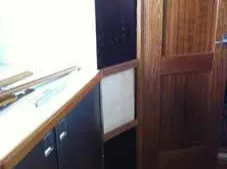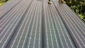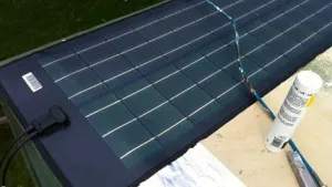 Dazu wurde das komplette Dach nochmals angeschliffen , mit 10-fach verdünntem Lack einmal lasiert. Dann die Kombikabel für Videosignal und Strom auf dem Dach verklebt und darüber die dünnen flexiblen Solarmodule geklebt.