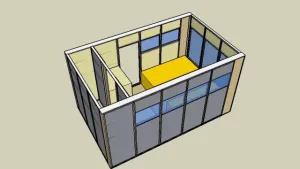 Das gibt eine Kabine 330x200cm im Grundriss. Sie ist 170 cm hoch und erhält ein Hubdach aus Filz/Wagenplane welches nochmals 70 cm geliftet werden kann!