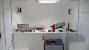 Rechts ist nur ein schmaler Staukasten mit extra Verstärkung, da dort die Schwenktischhalterung dran kommt. Ganz rechts im Eckchen der Toilettenschrank.