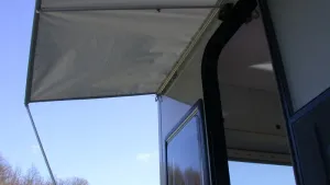 Die besteht aus einem Stück Airtex mit Keder auf der einen Seite und einem 25mm Durchmesser Saum auf der anderen Seite. Darin steckt ein passendes AL Rohr und an den Seiten sind 2 Ständer fest montiert. Das Ganze bleibt immer an der Kabine, wird einfach ausgerollt und mit einer Spannstange in der Mitte fixiert. Zur Fahrt wird links und rechts ein Gummi eingehakt.