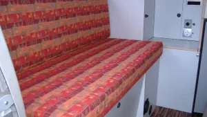 Nö, die Sitzgruppe ist nur zum sitzen. Theoretisch hätte man das so bauen können, dass dort ein Bett zu bauen wäre, aber ich brauchs nicht. Außerdem wäre dann der Ausgang und das Klo versperrt.