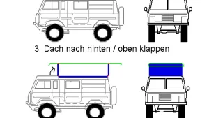 Die Kabine sah so ähnlich aus wie die vom Explorermagazin, also Aufstelldach vorne an der Alkovenspitze angeschlagen, mit Scharnieren. Die Dachschale wog ca. 80kg und wurde mit 2 Gasdruckfedern aufgestellt. Danach wurde die Rückwand von innen ausgeklappt, so dass das Dach damit unterstützt wurde. Dann wurden die 3-eckigen Seitenwände rechts und links von innen ausgeklappt.
