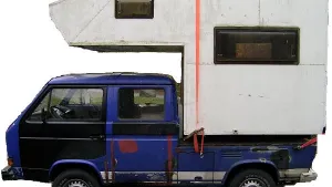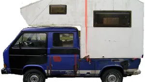Die Möbel sind noch gut, aber die komplette Innenverkleidung wurde vom Vorbesitzer bereits abgerissen. Ursprünglich war die Kabine auf einem Ford Transit. Die Grundfläche der Kabine ist aber wie für den T3 gebaut: Sie steht seitlich knapp 5 cm über, hinten ist sie bündig und der Alkoven schließt vorne mit der Oberkante der Windschutzscheibe ab.