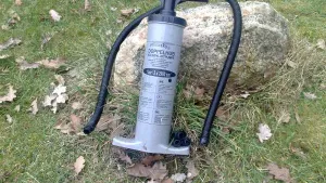 Was mir dann plötzlich vor die Nase viel war die Schlauchbootpumpe für 10,- €, die wahlweise entweder pumt oder saugt. Sie hat unter anderem einen Aufsatz der perfekt in den Wasserschlauch passt. Einmal pumpen und das Wasser ist komplett da...!