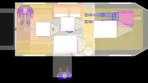 Großes Bett 1,90 x 1,90 wie zu hause. Geschlafen wird längs, so dass keiner über den anderen steigen muss. Über dem Bett genügend Platz zum aufrecht sitzen.
