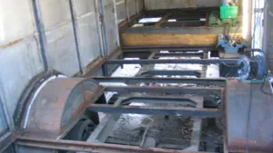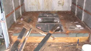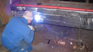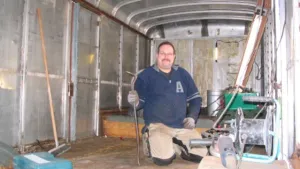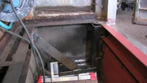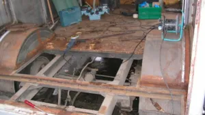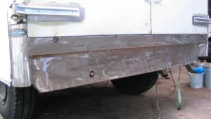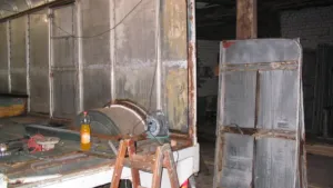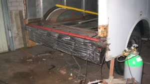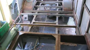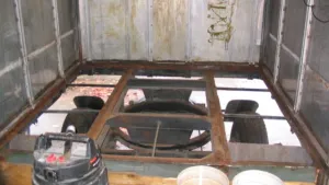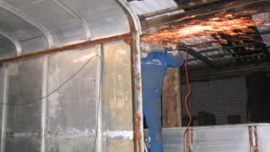 In den letzten Tagen haben wir jeden abend noch bis 20 bzw, 21.30 Uhr an dem Anhänger Hand angelegt. Als erstes die hinteren Türen abgebaut und Beschläge demontiert. Dann war die Heckpartie dran. Wo findige Schweißer Bleche und Winkeleisen immerwieder über verrostete Reste geschweißt hatten kam jetzt die große Flex. :twisted: