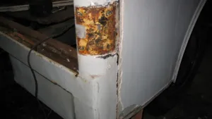 ich überlege, dass Du die Zurrösen ja nicht mehr brauchst, und dass Du wohl die korosionsfreien Strukturen stehen lassen wirst. Wenn du die verrosteten Zurrösenleisten abgenommen hast, passt da nicht ein Alu-Vierkantrohr hin? Den direkten Kontakt Alu auf Eisen an den Kreuzungspunkten kann man durch eingelegte Kunststoffstreifen dazwischen vermeiden, den Anschluß an die stehenbleibenden Senkrechtstreifen stellt man durch aufgenietete Alu- oder VAplättchen her. Das Aufnieten der Außenplatten in die Vierkant-Alus sollte dann problemlos mit wasserdichten Poppnieten gehen.
