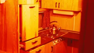 Neben dem Elektrikschrank kommt weiter rechts die Leiter, welche auch im heruntergefahrenen Zustand als Regal dient.