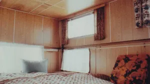 Als Anhang ein Aufriß der Einbauten und ein Blick vom Heck in Richtung Front ,mit rechts befindlicher Naßzelle. Der Alkoven ist nach oben gefahren.