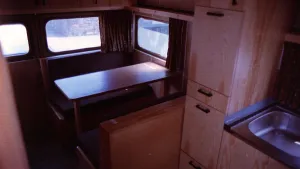 Der Tisch der Gruppe ist als Hängetisch mit Fuß arretiert , aber auch abnehmbar. Man erhält bei der Fahrt mehr Bewegunsfreiheit. Legt man die Tischplatte zwischen die Sitze entsteht ein Schlafplateau. An den Sitzen in Fahrtrichtung brachte ich Sicherheitsgurte an.