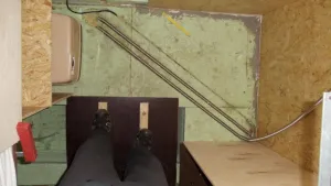 Bild 2 Ansicht von hinten auf Bett und die darunterliegende vorläufige Verkabelung.